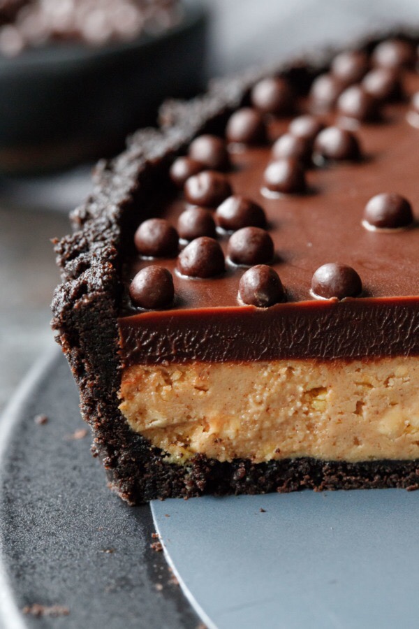 With a crunchy peanut butter filling and creamy chocolate ganache nestled in a sweet and salty chocolate cookie crust, it’s like a giant peanut butter cup, but bigger and so much better. While it looks downright impressive with its perfectly defined layers it takes less than 45 minutes of active time to prepare, although you do need to allow for sufficient chill time between layers and before serving.