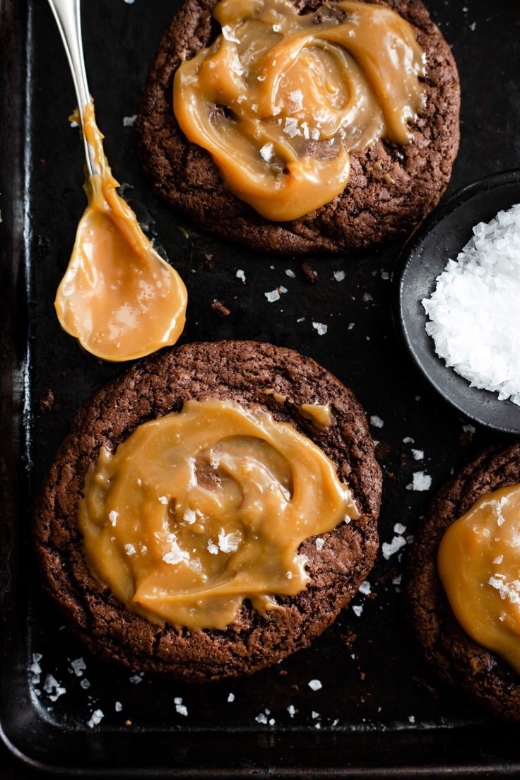 Spread the cookies with caramel and sprinkle with sea salt.